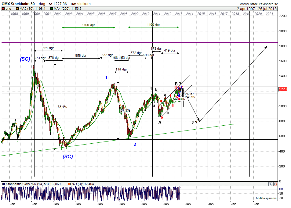 OMX30 är enligt min tolkning i ett BEAR market rally sedan september 2011. Med utgångspunkten att botten från Oktober 2002 är en "större botten" ala supercykel, så är uppgången sedan dess en cykel våg 1 och 2 samt i Januari 2011 en "större våg 1". Därefter en nedång till 833 som är en A-våg för fortsatta nedgångar efter en B-vågs topp. Denna B-våg har enligt Elliott inget "tekniskt tak" utan kan pågå i oändligheten mot allt högre toppar. Av den anledningen ska man ha respekt för B-vågor som går över sin tidigare topp, de kan lätt tolkas som en 1-5 våg och när man tror att de avslutas, så kan de lika gärna fortsätta med en ny a-c rörelse upp. För min del så vill jag ha en lägre topp i primärtrenden konstaterad, innan jag blåser på med att B-vågen är klar och position för en lite rappare nedgång i c-vågen tagit vid. Om tidigare topp bryts upp, ja då är det bara att tålmodigt vänta in nästa a-c rörelse mot en ny högre topp innan nästa bevakning mot en eventuellt lägre topp görs.
