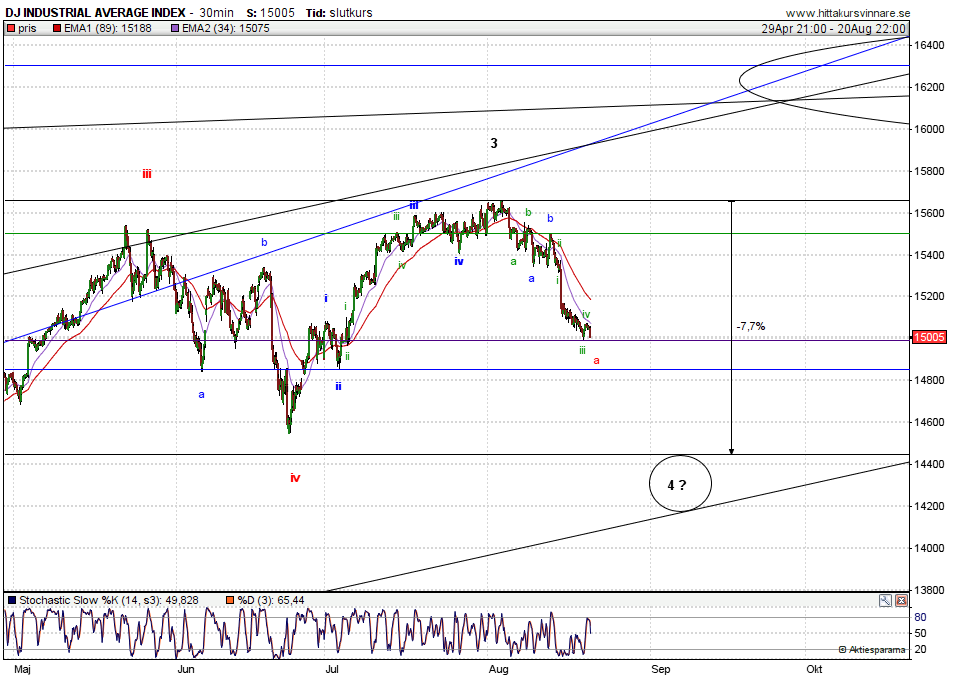DOW toppade på 15658 den 2:e augusti, den toppen är en primär våg 3 i en större våg 3 räknat sedan den 6:e mars 2009. DOW ska nu genomföra en lite större nedgång om 7-10% till området fib38,2 14260 - 14550 (S4 botten) vilket blir primär trends våg 4. Bryts dock 13340 i denna nedgångsfas så ska tolkningen växlas till BEAR enligt mina S&P500 chart.