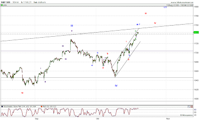OMX30 toppade på 1292 den 19:e september, näst intill på 2 års dagen av detta ben upp från 833. Fram till 1292 kan jag räkna in 7 överlappande vågor upp. Därmed finns möjligheten till att 1292 är toppen för denna sekvens likväl som ytterligare två våg sekvenser upp, kan finnas kvar.