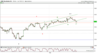 OMX30 ser ut att impulsera ned i det korta från 1432, dock höll 1385, så inget brott av rekyl mönstret än.