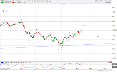 Index har kommit upp till 1598 så lång och är i området mellan fib61,8 och fib76,4. Tolkar fortsatt denna rörelse som en D-våg i en triangel till C-4 botten. Jag kan räkna in 7 vågor upp, så en topp kan vara inne på 1598, samtidigt som Index kan fortsätta att sub indela sig upp.